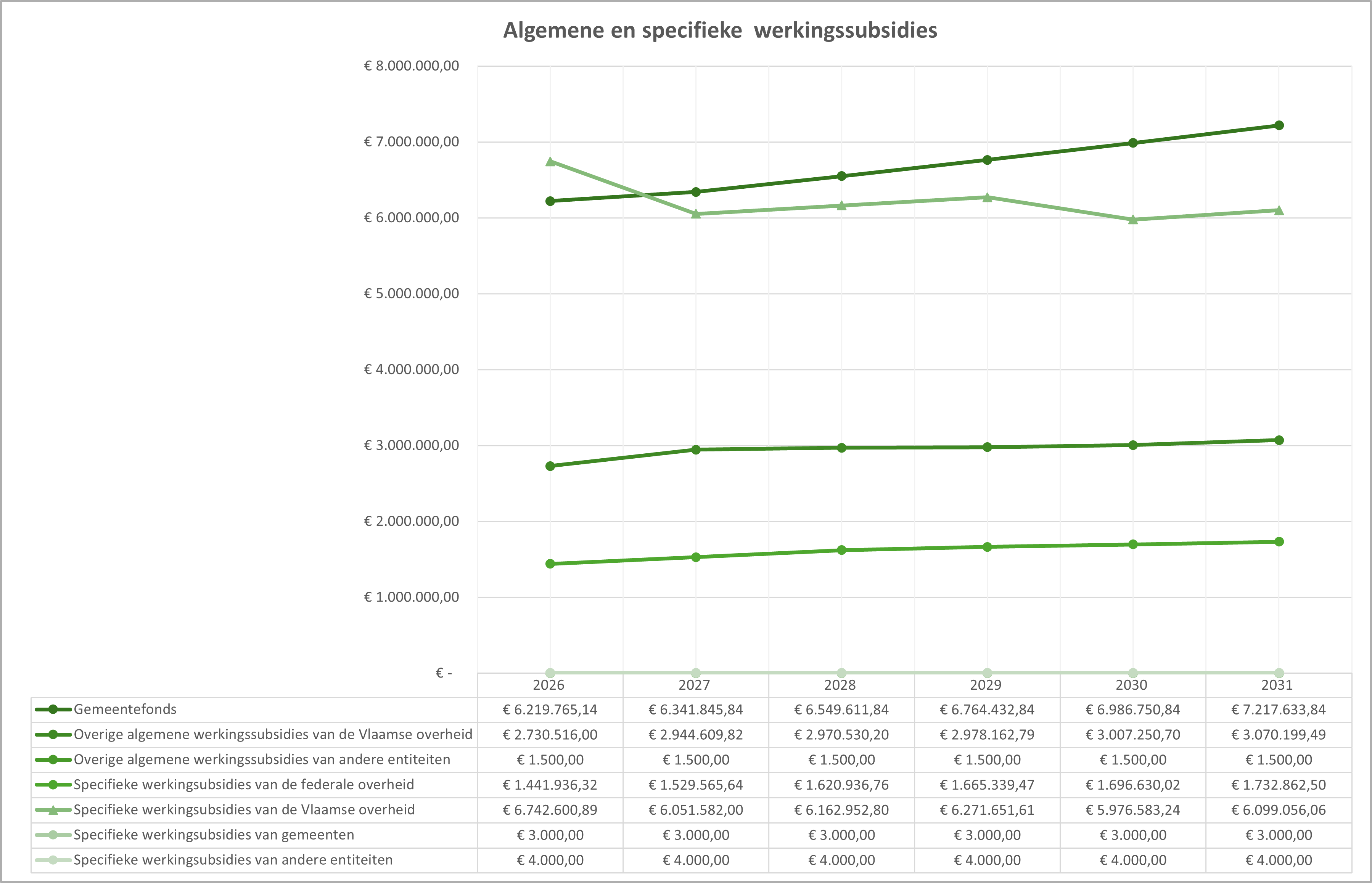 Algemene werkingssubsidies zijn middelen van hogere overheden (bv. Vlaamse overheid, federale overheid) die de gemeente vrij kan aanwenden voor haar werking en beleidskeuzes.