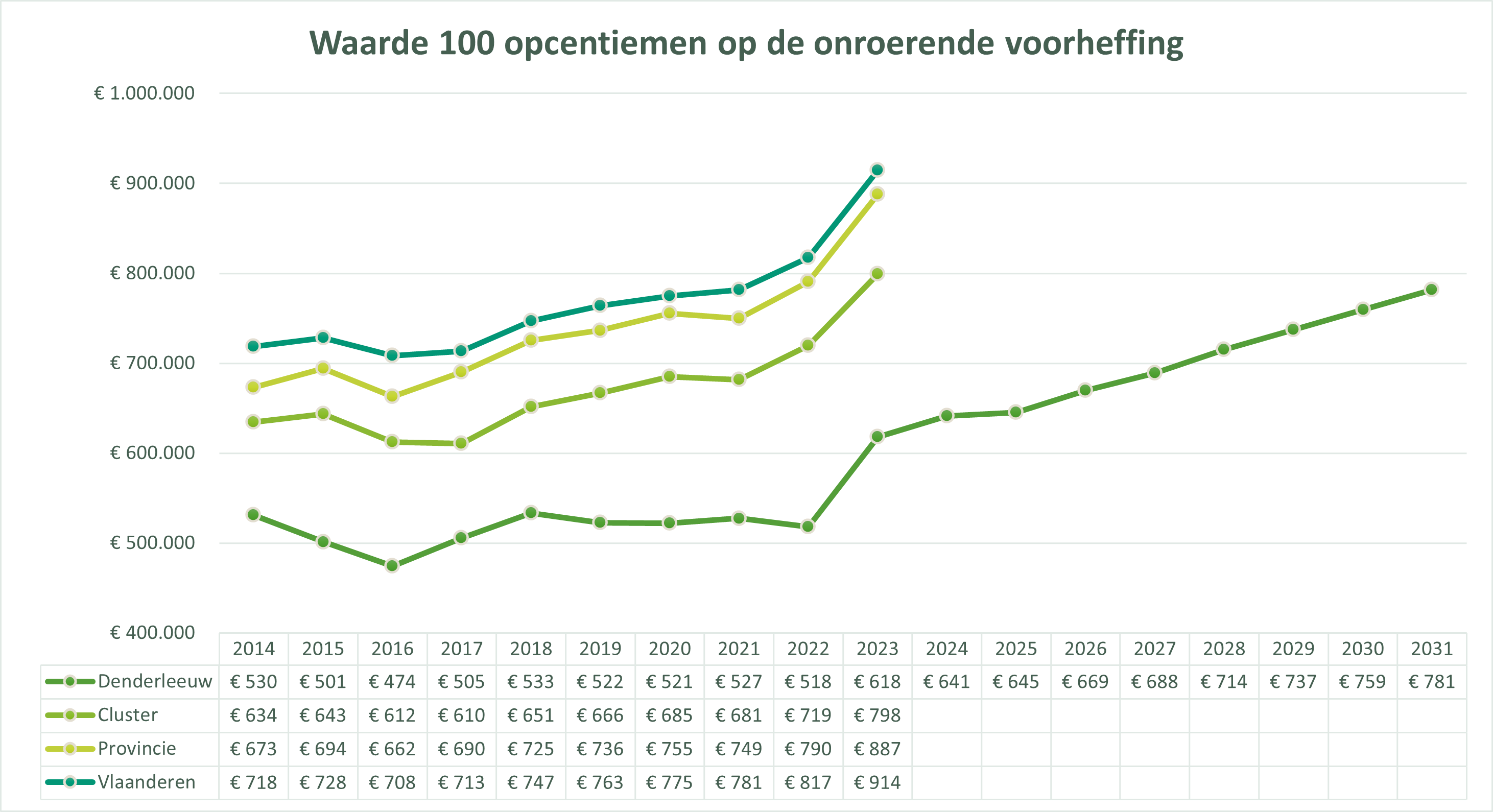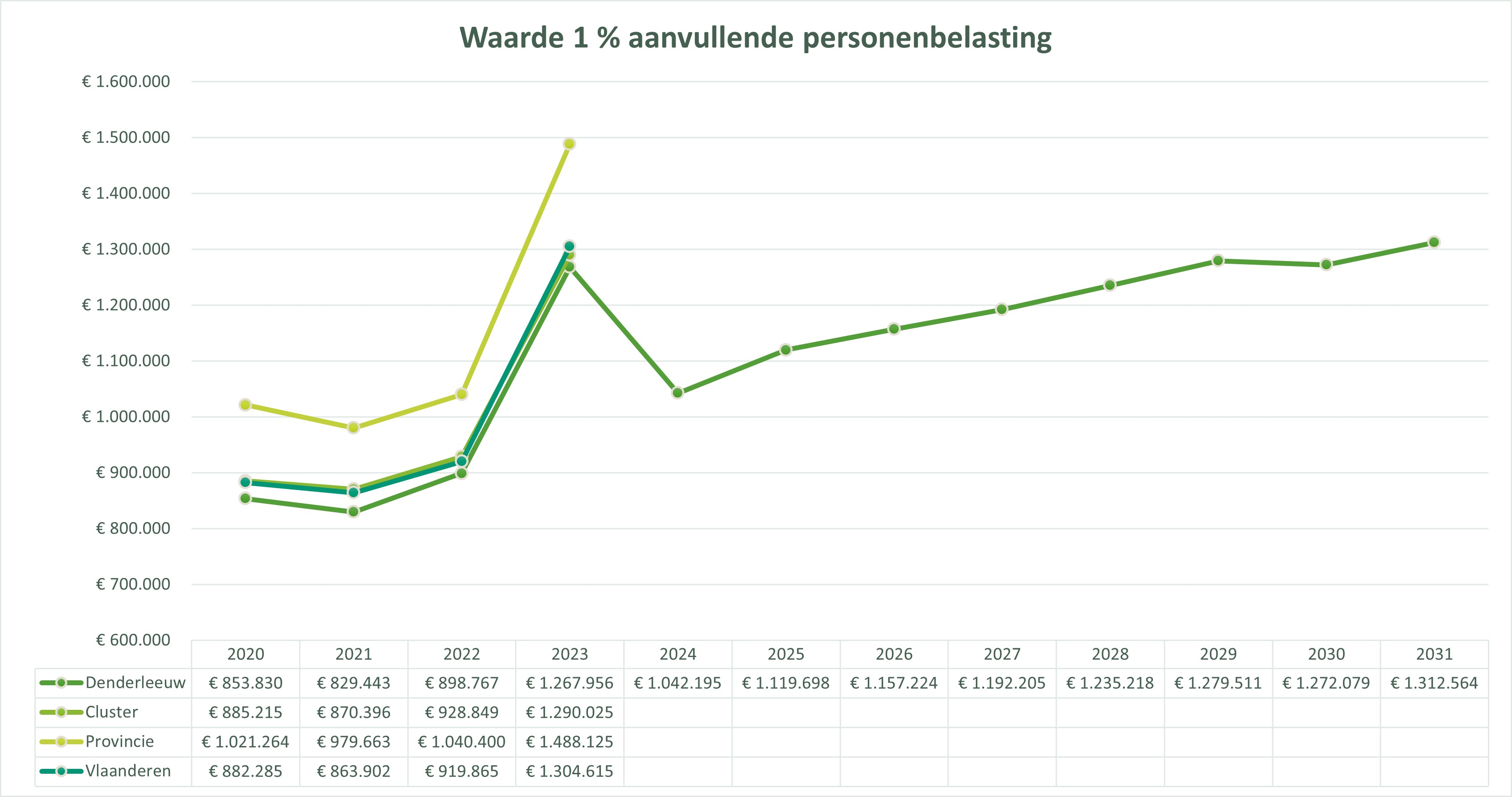 Voor het lokaal bestuur Denderleeuw schommelt dit rond de 25 % (aanvullende personenbelasting) en 15 % (opcentiemen op de onroerende voorheffing).