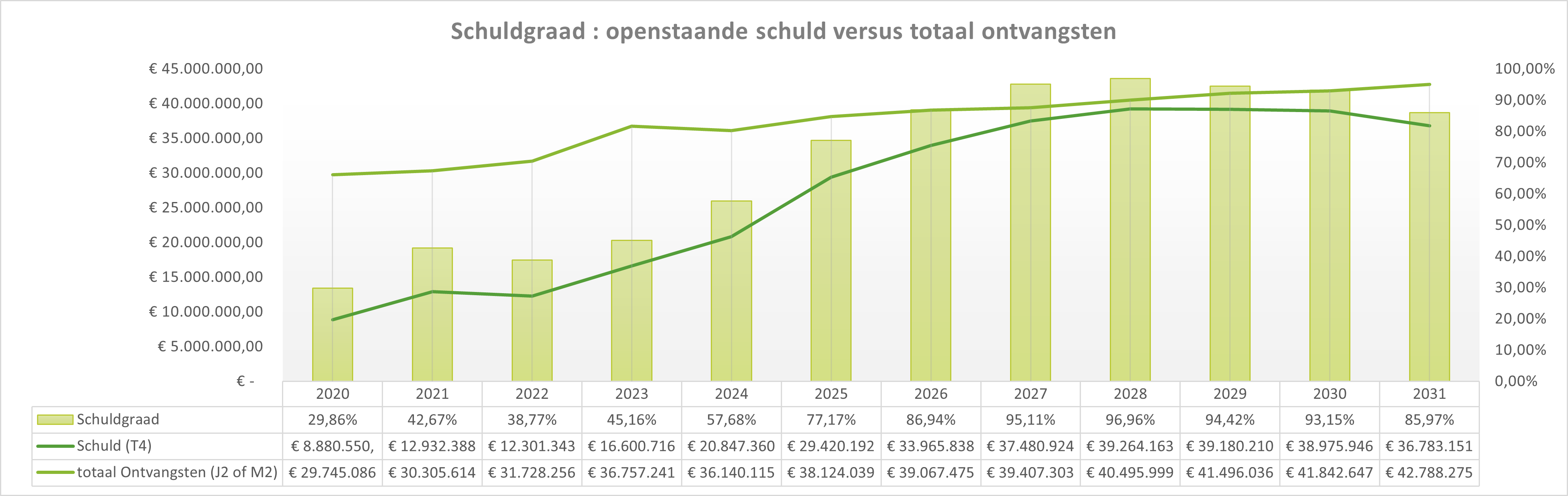 Los van beide financiële evenwichtscriteria (positief RKB in elk jaar, en positieve AFM in het laatste jaar van het meerjarenplan), is het aangewezen om op vlak van schuldopbouw ook enige voorzichtigheid aan de dag te leggen.