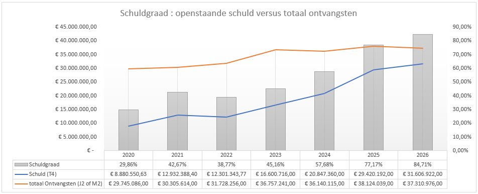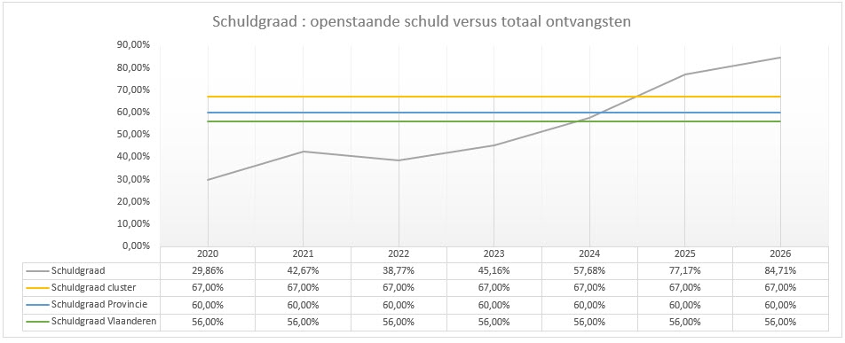 Los van beide financiële evenwichtscriteria (positief RKB in elk jaar, en positieve AFM in het laatste jaar van het meerjarenplan), is het aangewezen om op vlak van schuldopbouw ook enige voorzichtigheid aan de dag te leggen.