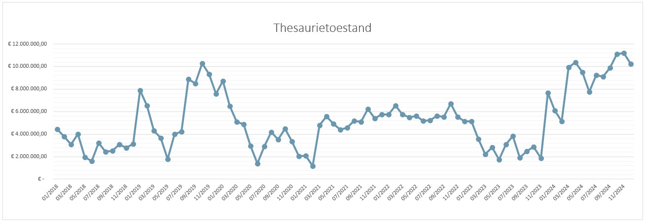 De rente op lange termijn blijft historisch laag. Maandelijks wordt de liquiditeitspositie van ons lokaal bestuur opgevolgd, om in te schatten op welk moment het aangewezen is om bijkomende leningen aan te gaan, die nodig zijn om het investeringsprogramma van het lokaal bestuur te financieren.