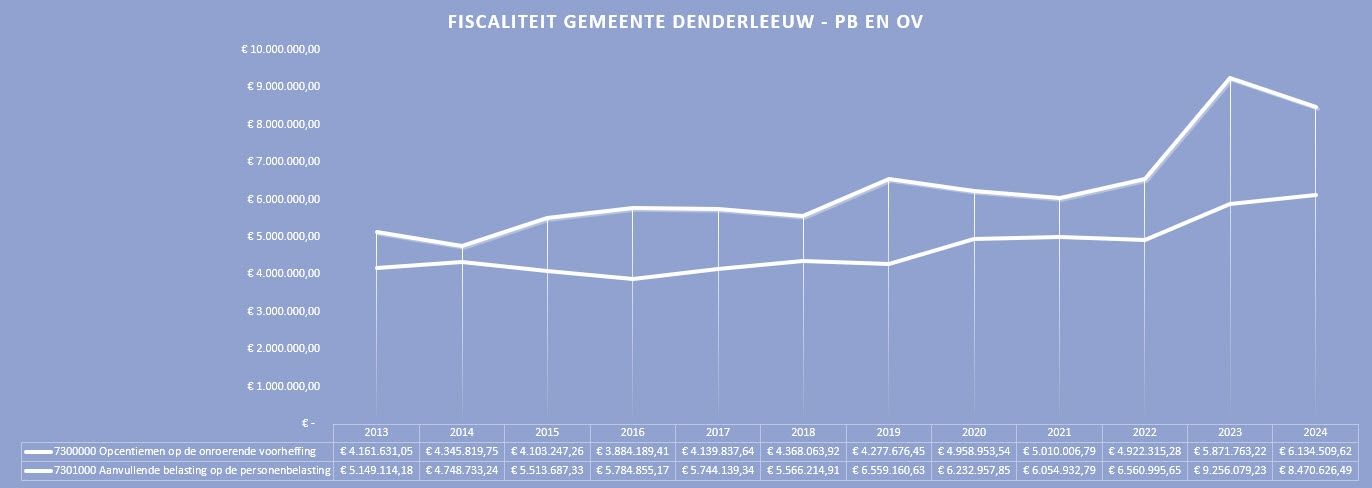 De ontvangsten uit de aanvullende personenbelasting (APB) is voor de meeste Vlaamse gemeenten één van de voornaamste en meest stabiele inkomstenbronnen. Uit een analyse van de VVSG is evenwel gebleken dat de afhankelijkheidsgraad van deze belasting (aandeel APB in het totaal van de exploitatie) sterk schommelt van de ene gemeente ten opzichte van de andere. Gemeenten met een 0-tarief zijn helemaal APB-onafhankelijk, andere gemeenten halen tot 40 % à 50 % van hun totale ontvangsten uit deze belasting. Voor de gemeente Denderleeuw schommelt dit rond de 20 %.