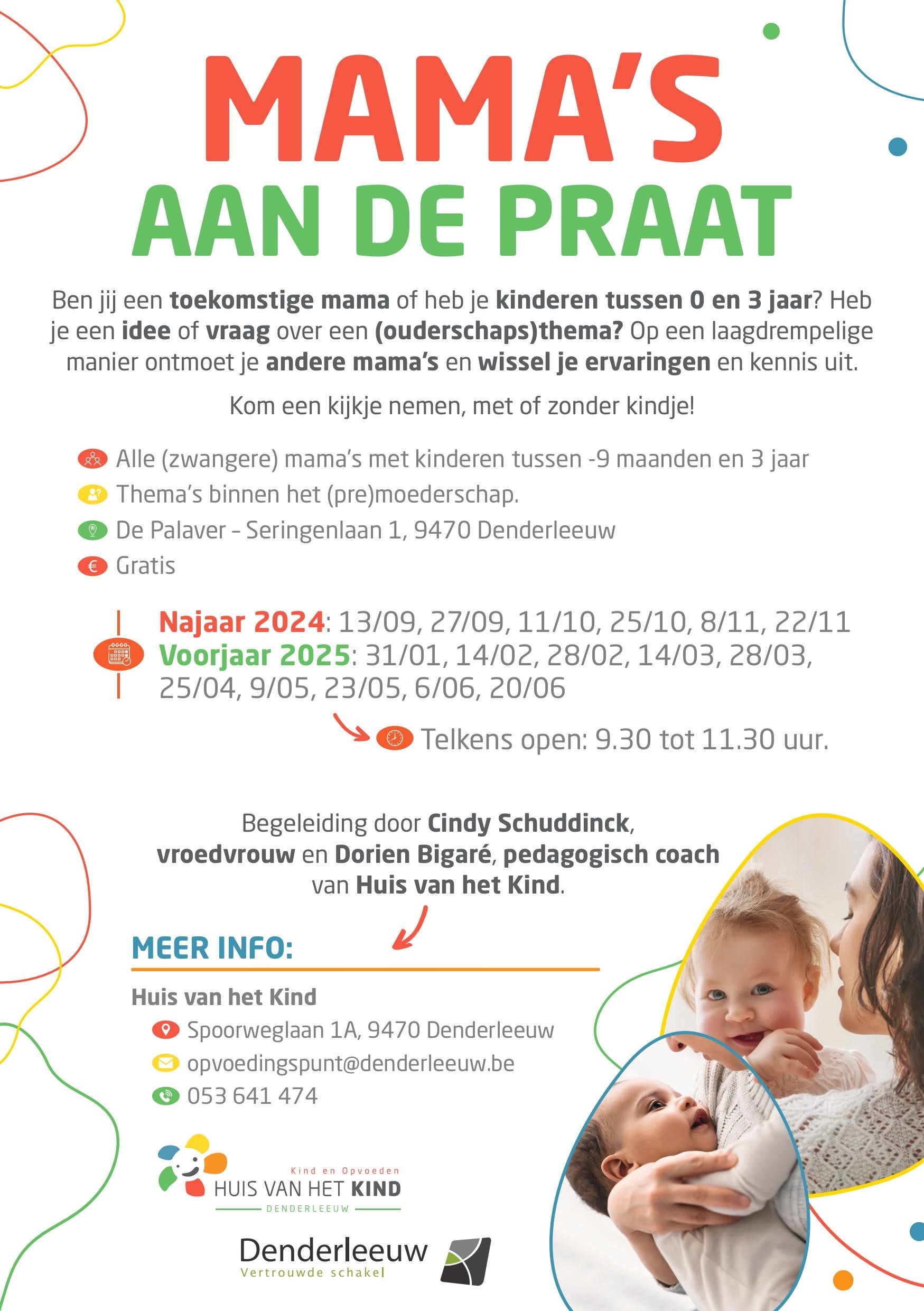 In 2025 werden de bijeenkomsten "Mama's aan de praat" verdergezet. Deze praatgroep richt zich tot alle (zwangere) mama's van -9 maanden tot 3 jaar en wordt begeleid door de pedagogisch coach en een vroedvrouw. Naast het centraal stellen van de ontmoeting tussen deze mama's worden heel wat ouderschapsthema's besproken, soms in samenwerking met een externe spreker. In het voorjaar hadden we het over: spelen met je baby en peuter (gericht op de motorische ontwikkeling, veerkracht binnen het ouderschap (2 sessies), draagdoeken, een warme overgang naar de kleuterklas, hoe leer je je kindje gevarieerd eten, ecologisch ouderschap, goed genoeg ouderschap en belonen en straffen anders bekeken.
