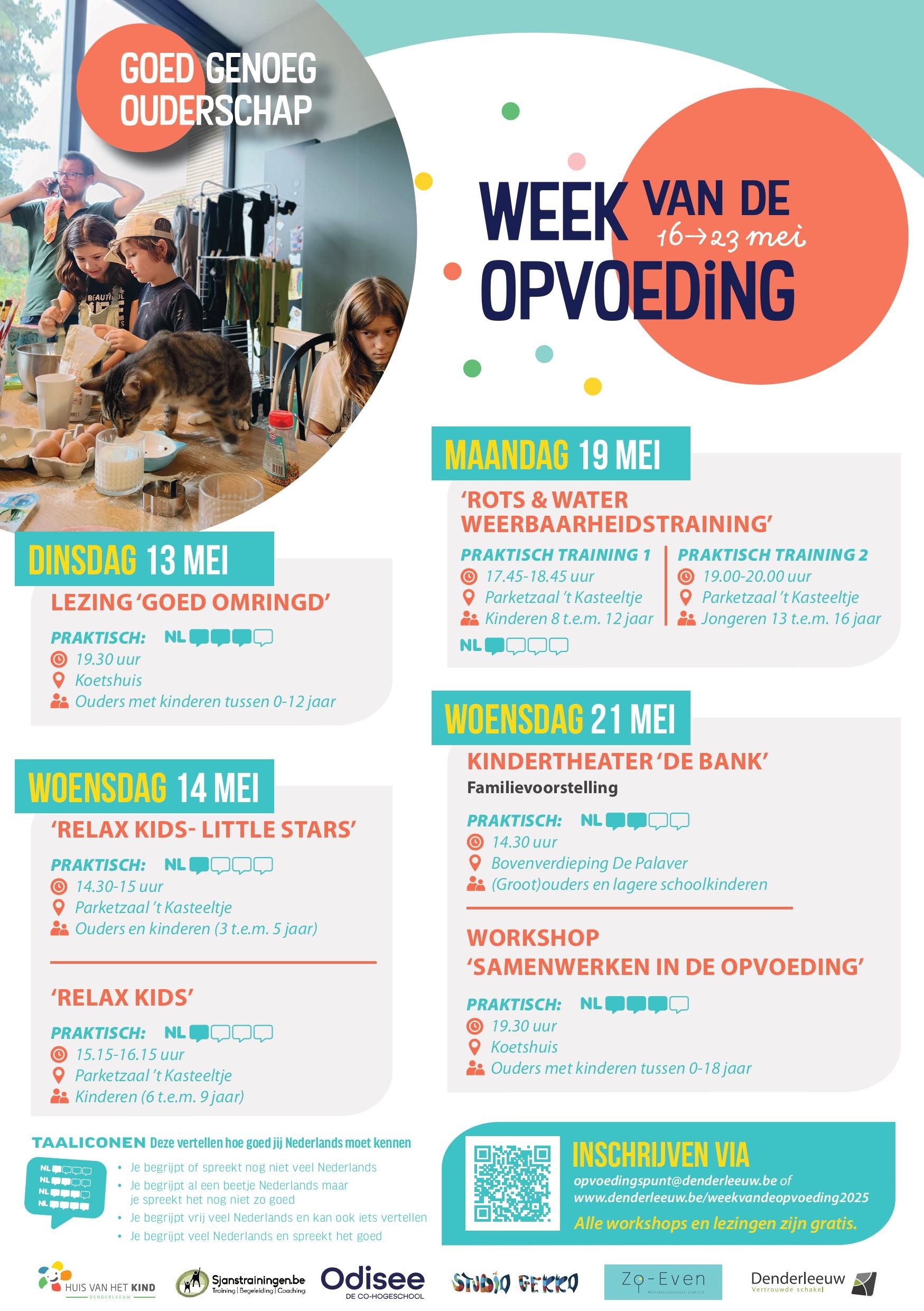 - De Week van de Opvoeding 2025 vond plaats tussen 16 en 23 mei, met als thema 'goed genoeg ouderschap', waarbij een aantal vormingen en workshops bepaalde (opvoedings)thema's mee hielpen bespreekbaar maken. Het vormingsaanbod is er voor gezinnen met (klein)kinderen van 0 tot 18 jaar en voor professionals die werken met gezinnen en kinderen. Er werden ook enkele activiteiten voor kinderen en tieners voorzien: